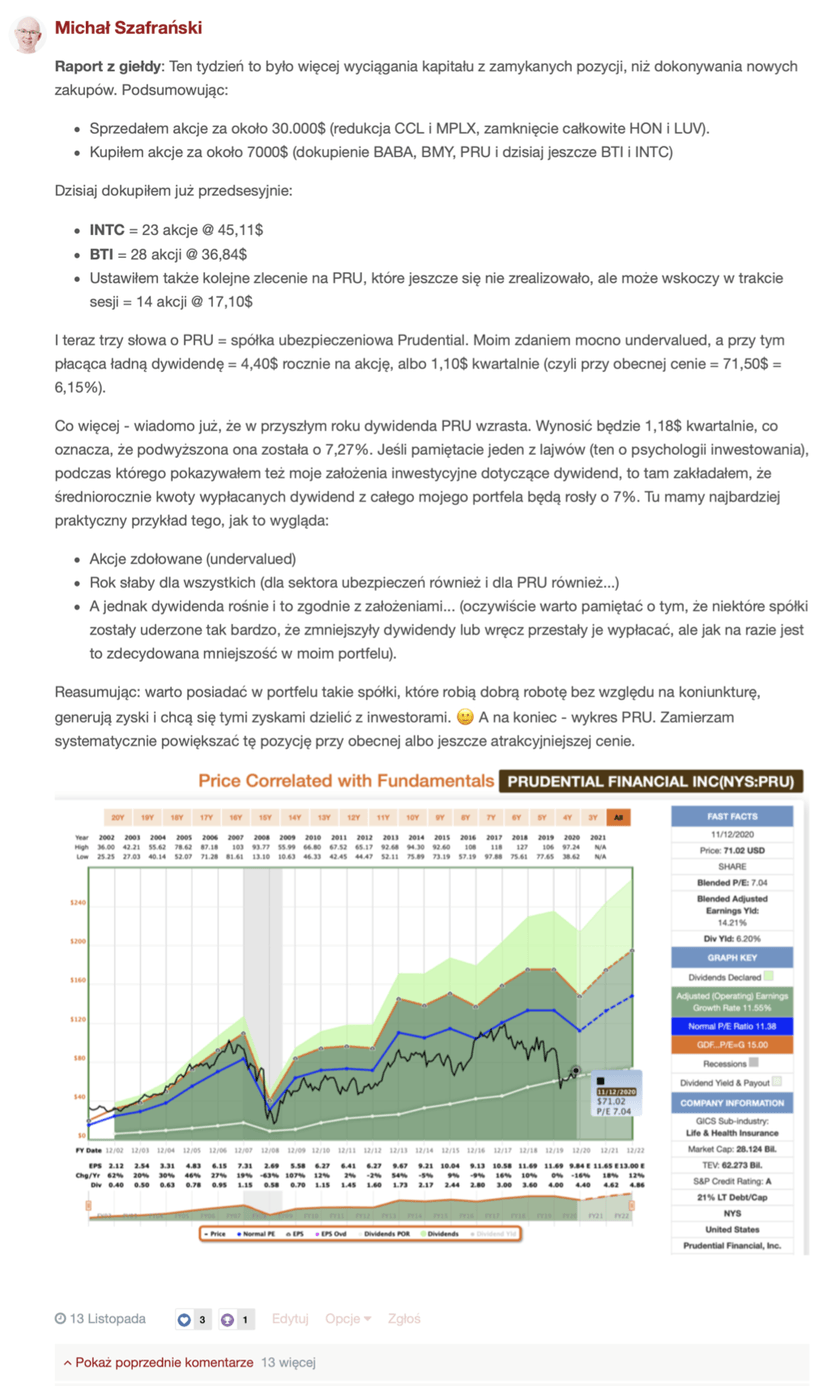 Regularnie publikuję także "Raport z giełdy", w którym szczegółowo przedstawiam moje decyzje inwestycyjne oraz informuję o transakcjach zakupu i sprzedaży akcji, kryteriach decyzyjnych itp. To najchętniej komentowane z moich statusów.