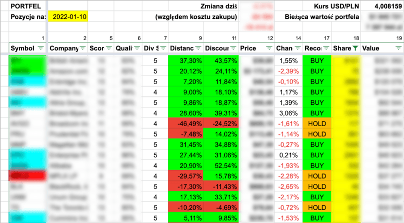 Arkusz z moim portfelem akcji spółek zagranicznych (głównie dywidendowych). Klanowicze zainteresowani tematyką inwestowania dywidendowego mogą nie tylko poszerzać wiedzę w ramach cyklu lajwów na ten temat, ale także w pełni podejrzeć skład mojego portfela, który płaci obecnie ponad 75.000$ rocznie w dywidendach.